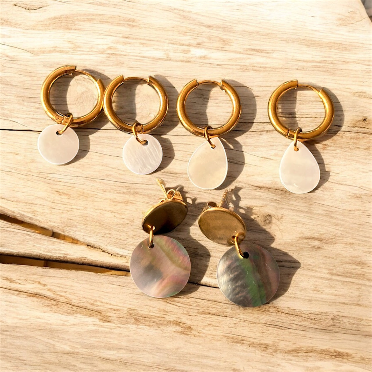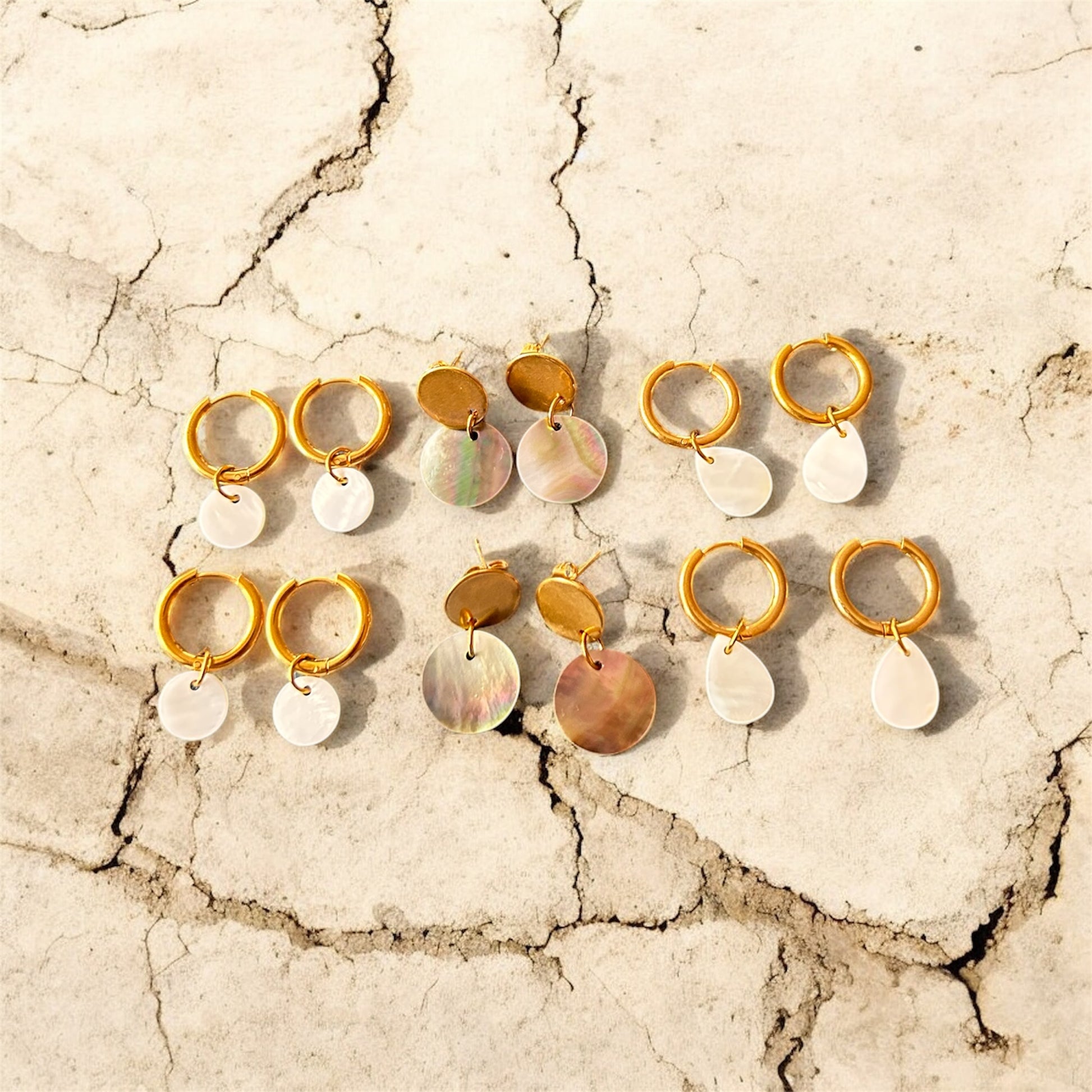Elegant, timeless, and effortlessly chic — our Natural Mother of Pearl Earrings are designed to add a soft glow to any look. Crafted from gold-plated stainless steel with natural mother-of-pearl drops, each piece reflects unique iridescent tones that catch the light beautifully. Choose your favourite design — round, teardrop, or double-disc — and elevate your everyday style. Waterproof and tarnish-free for lasting shine.