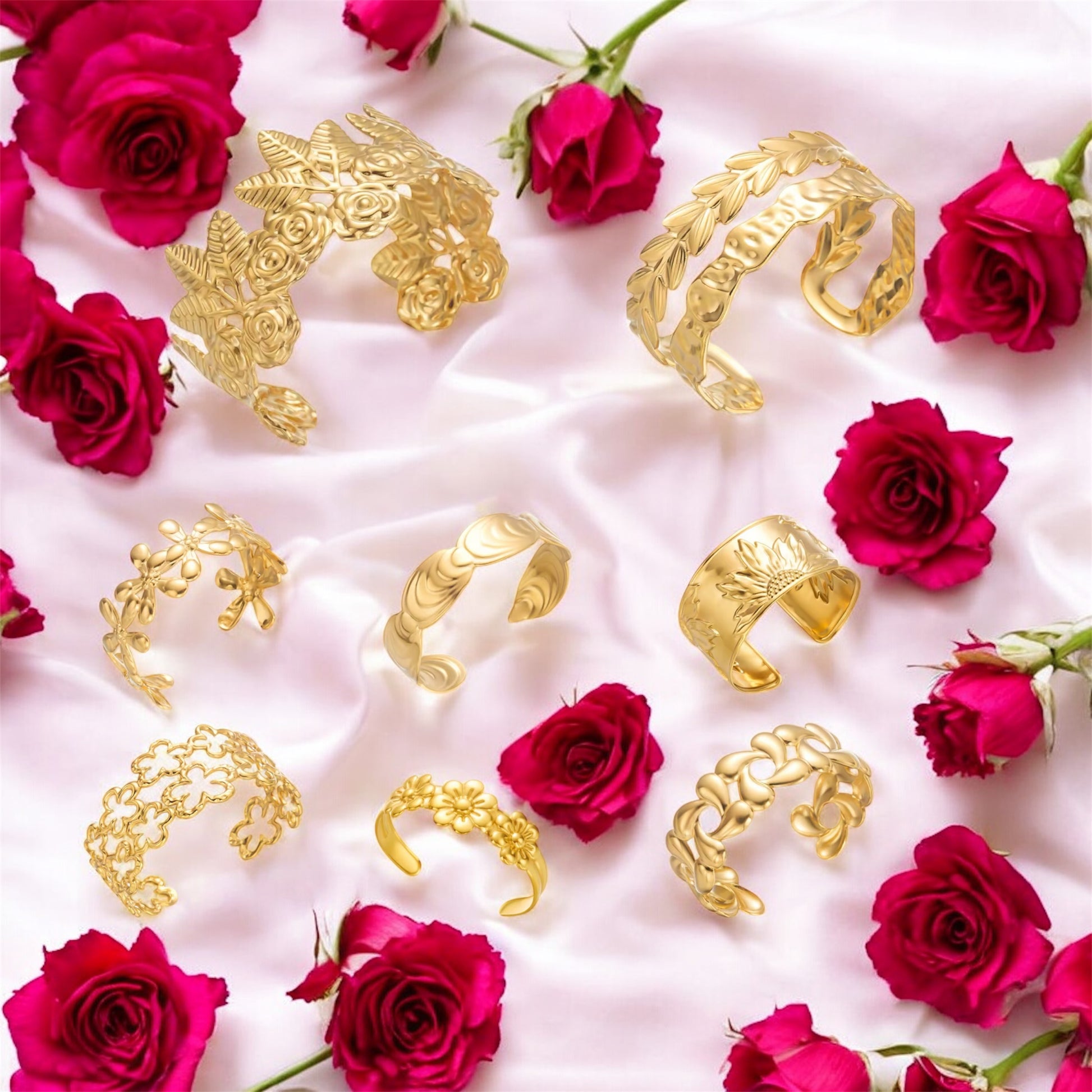 A must-have piece for anyone who loves feminine jewellery. These cuffs feature beautiful floral details and a smooth, comfortable finish. Perfect for stacking or wearing alone.