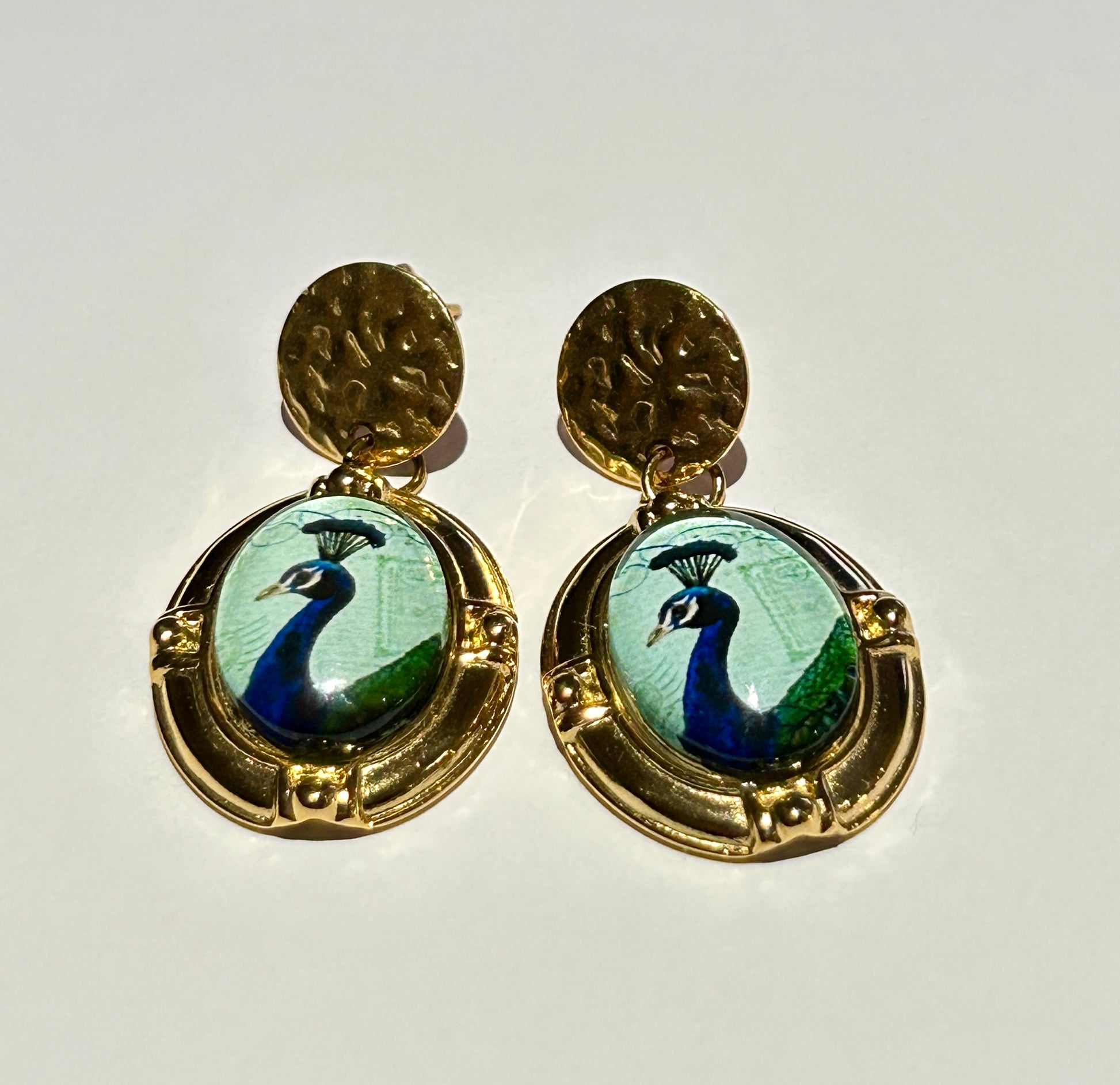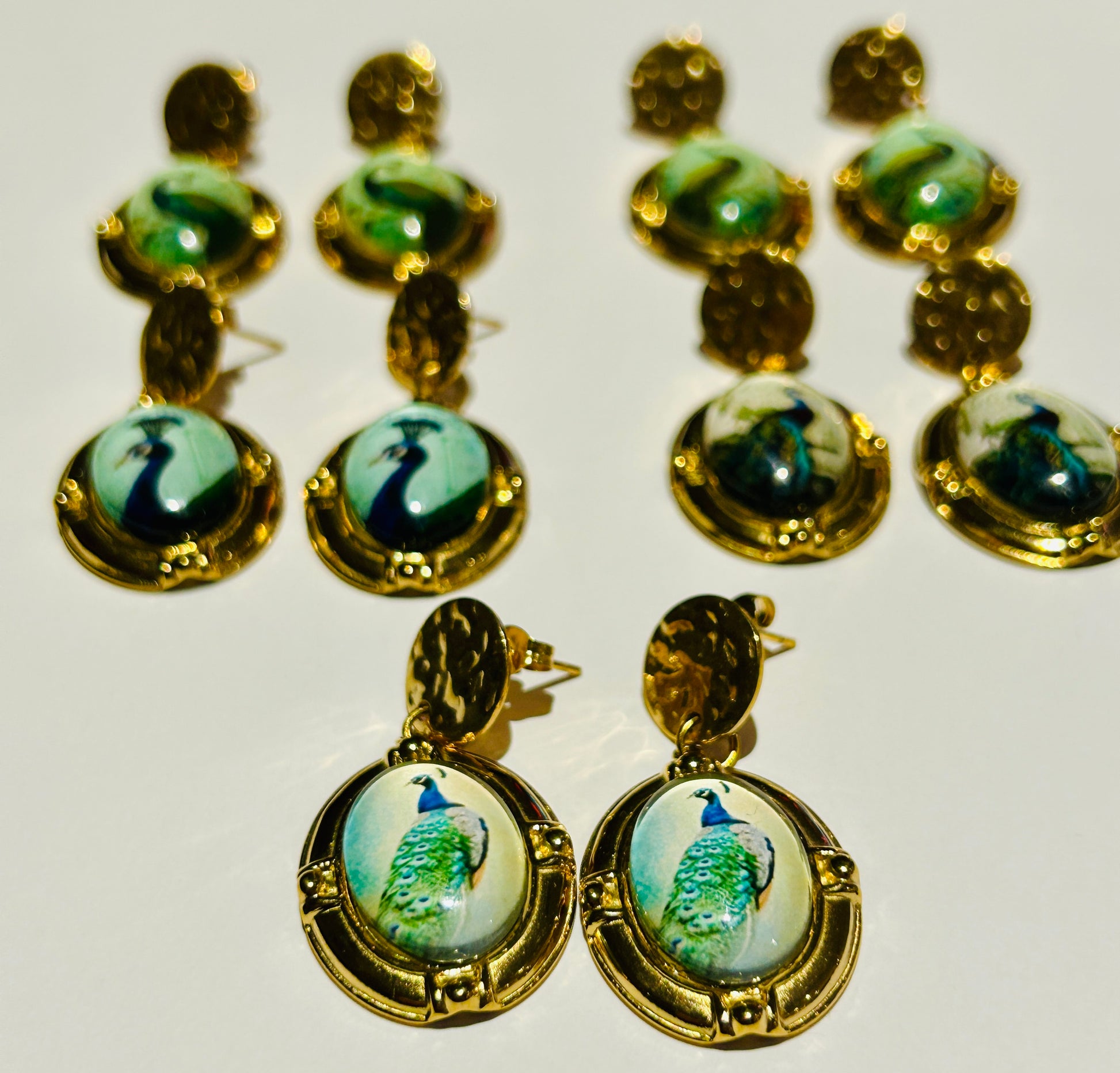 Grace your look with these stunning Royal Peacock Art Drop Earrings — a blend of elegance and artistry. Each piece features a delicate peacock design sealed beneath clear resin for a glossy, glass-like finish, framed in premium stainless steel with a hammered gold top. Lightweight, waterproof, and tarnish-resistant — perfect for adding a hint of royal charm to both traditional and modern outfits.