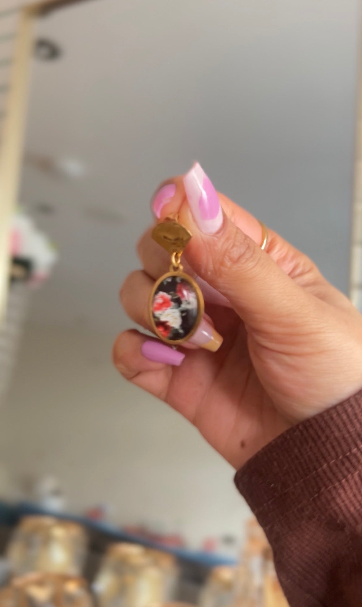 Vintage-inspired drop earrings featuring oval frames with delicate floral artwork.